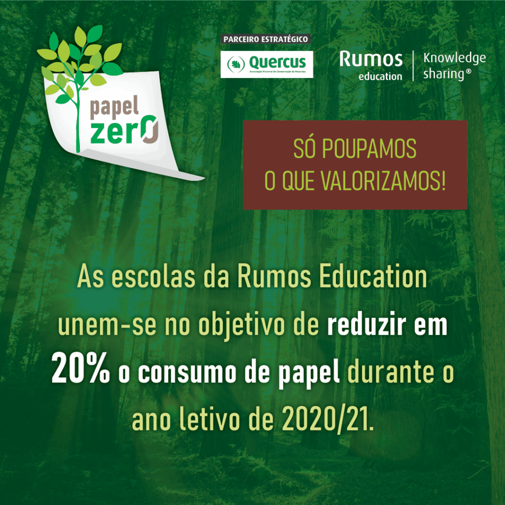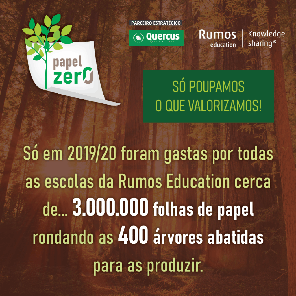 No ano letivo 2019/20 foram gastas por todas as escolas da Rumos Education cerca de 6000 resmas de papel, o que significam 3.000.000 folhas de papel rondando as 400 árvores abatidas para as produzir.